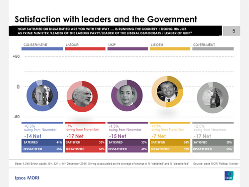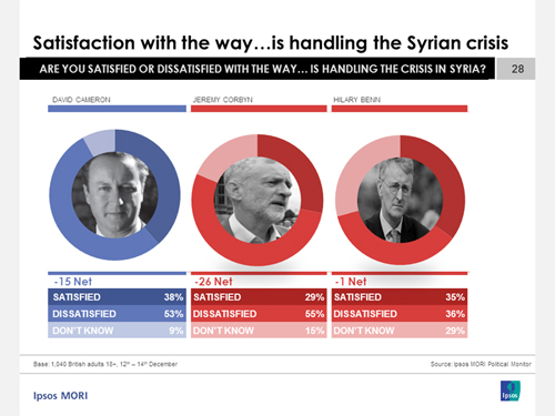“We know the public are more worried than before about the threat of a terrorist attack, and few are convinced that the air strikes will make Britain safer – although they are divided on whether it will actually make Britain more of a target. Satisfaction with the way the party leaders are handling the crisis splits broadly on party lines, although Hilary Benn gets higher ratings among non-Labour voters. Meanwhile, our long-term trends on overall satisfaction ratings show it’s not unusual for opposition leaders to find it hard to get through to the public – but Jeremy Corbyn is dividing opinion more quickly than most, and has clearly taken a hit in his scores this month.”