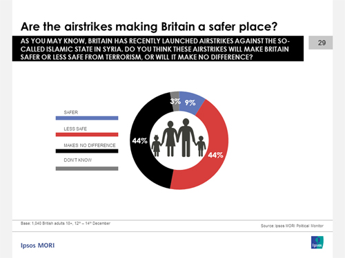 New polling from Ipsos reveals that few Britons believe air strikes in Syria against ISIS will make Britain safer from terrorism. The survey, taken after the House of Commons voted to approve the air strikes, shows just one in 11 (9%) think the air strikes will make Britain safer while most of the public are evenly split between thinking the action will either make Britain less safe or make no difference at all (44% each).