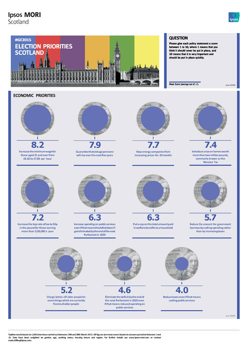 With exactly a month to go before what promises to be a tightly contested general election, today we publish the findings of a poll for BBC Scotland outlining the priorities of voters in Scotland. Scoring a range of policy statements about different economic choices, voters give clues as to what they will be looking out for in the party manifestos which will be published over the coming days.