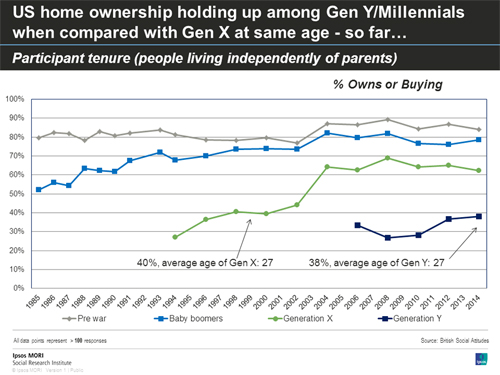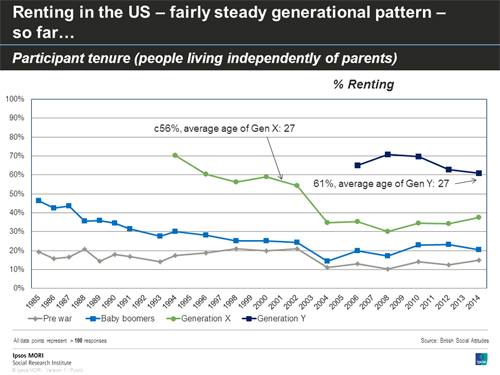 In 2014, when the average age of Generation Y was 27, 32% owned their own home. This compares to 55% of Generation X being homeowners in 1998, when the average age for this generation was also 27. There has been a similar rise in the proportion who rent their house from a private landlord – for Generation X in 1998 the proportion was 24%, whilst for Generation Y in 2014 the comparative figure was 45%. This pattern is not replicated in the United States, where analysis of data from the General Social Survey shows that levels of home ownership and renting from private landlords amongst Generation Y are similar to those of Generation X.