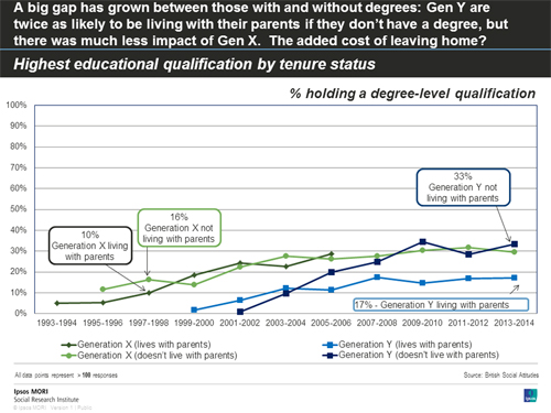The proportion of those from Generation Y who live at home is also higher compared to Generation X at a similar age. Unlike in Generation X, there are clear differences in educational qualifications between those members of Generation Y who live at home with their parents and those who live independently, with those who live at home less likely to hold degree-level qualifications (17% of those who live at home with their parents and 33% of those who live independently).