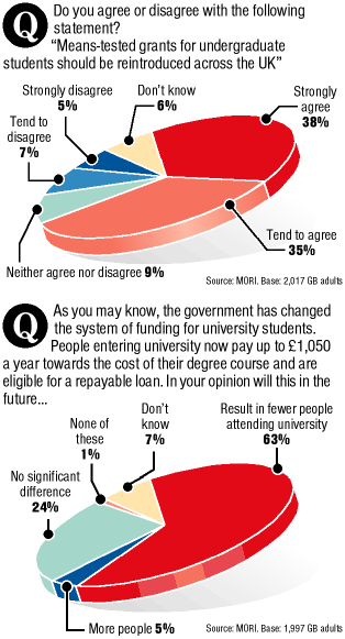 The tuition-fees poll showed that almost 64 per cent of those intending to vote Labour in the election thought fees and loans would mean fewer people at university: 75 per cent of them agreed that grants should be reintroduced.