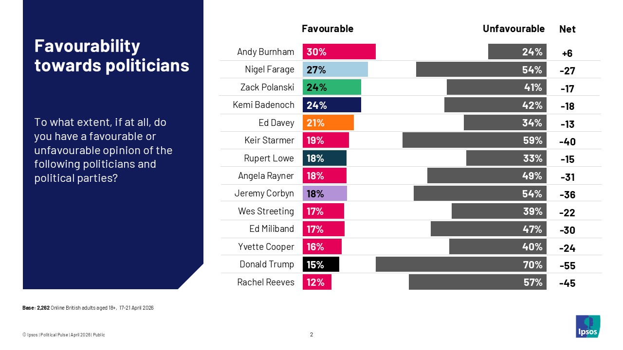 - 24% of Britons are favourable towards Green party leader Zack Polanski (+1 from Mar ’26), 41% unfavourable (+4 from Mar ’26), giving him a net score of -17 (was 14 in Mar ’26).