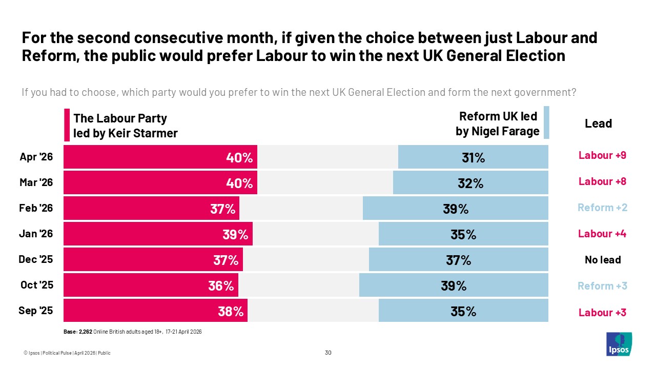 Despite speculation about the Labour leadership, if given the choice between just the Labour party led by Keir Starmer and Reform UK led by Nigel Farage, Britons would prefer Labour to win the next UK General Election. Four in ten (40%) Britons prefer Labour, while three in ten (31%) prefer Reform. This gives Labour a lead of +9 (+1 from Mar ’26).