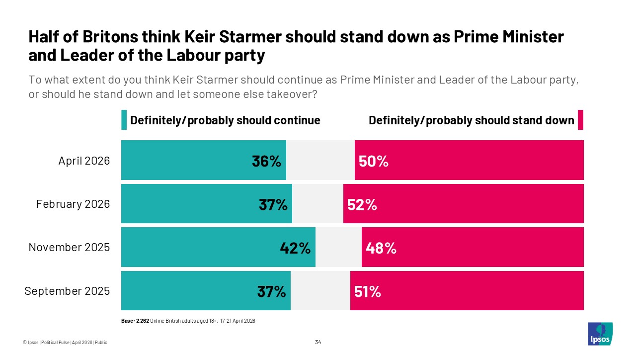 New data from Ipsos in the UK’s Political Pulse survey, taken 17-21 April 2026 reveals half (50%) of Britons think Keir Starmer should stand down as Prime Minister.