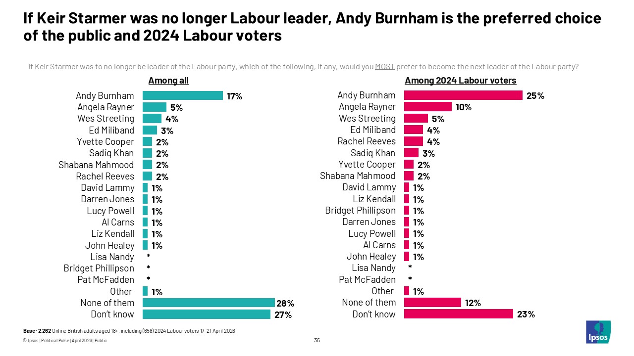- If Starmer was no longer Labour leader, Andy Burnham leads as the public’s preferred choice to be leader (17%). Burnham also leads among 2024 Labour voters (25%). However a sizeable proportion of the public say either none of them (28%) or don’t know (27%).