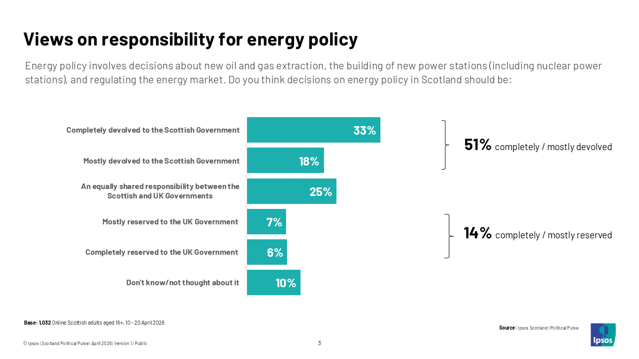 - Over half of Scots (51%) think that energy policy should be devolved to the Scottish Government, while a quarter (25%) feel responsibility should be shared equally with the UK Government and 14% that it should be reserved to Westminster.