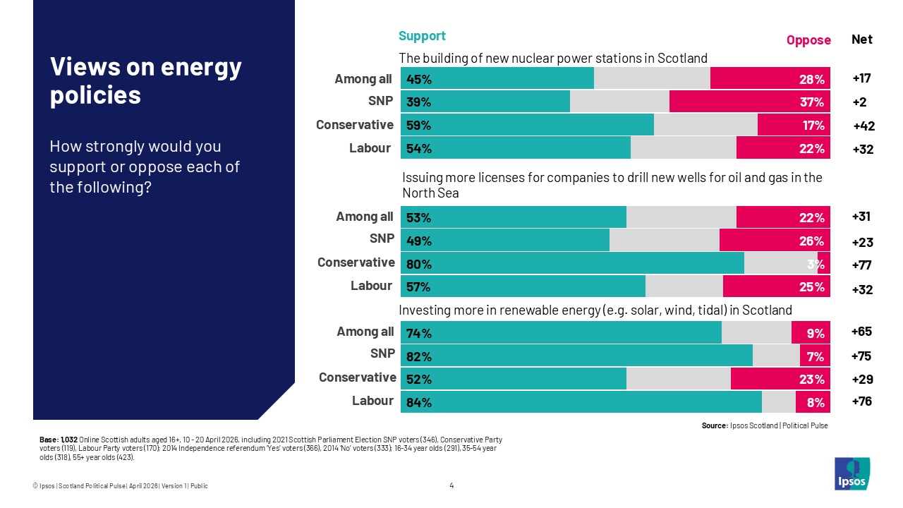 - More Scots support than oppose investing more in renewables (74% support), issuing more licences for new oil and gas drilling (53%) and new nuclear development in Scotland (45%).