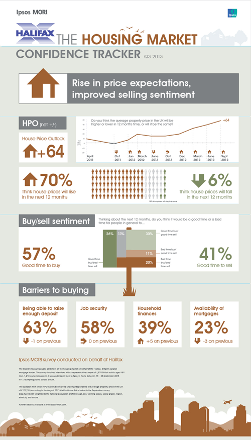 HPO, the headline House Price Outlook balance (i.e. the proportion of people that expect the average house price to rise in the next 12 months less those who think it will fall), reached +64 in September 2013.This is a rise from +40 in June, and continues the upward trend since October 2012, when HPO stood at +15.