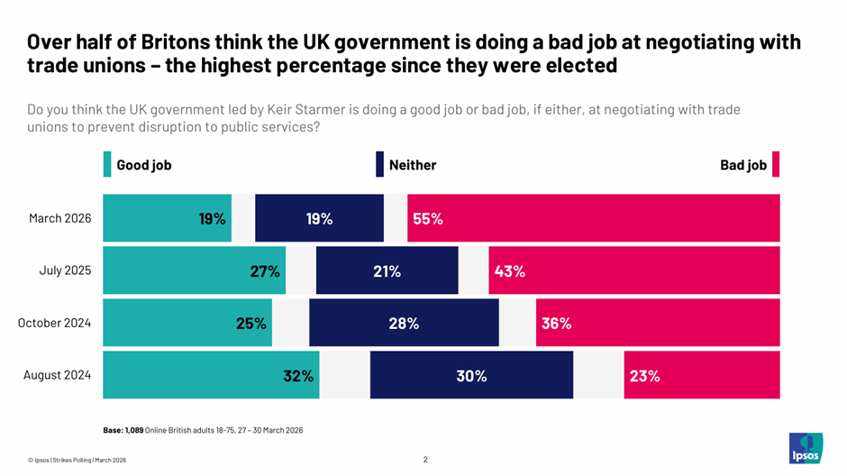 • 55% of Britons now say the UK Government, led by Keir Starmer, are doing a ‘bad job in negotiating with unions to prevent public service disruption’ (up from 43% in July 2025 and 23% in October 2024)
