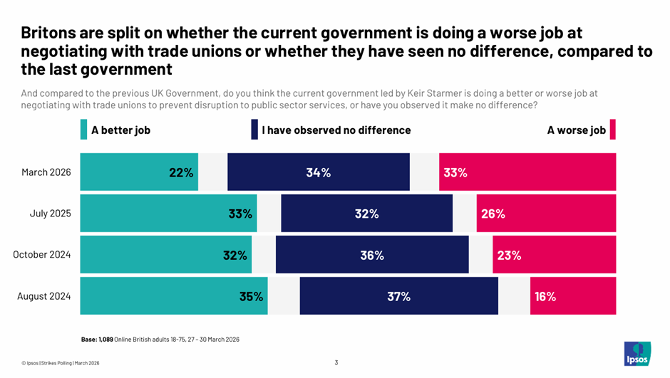 • Comparison with previous government: Less than one in four now say the current Government is ‘doing a better job’ than the previous government at negotiating with trade unions (22% in March 2026 compared to 33% July 2025).