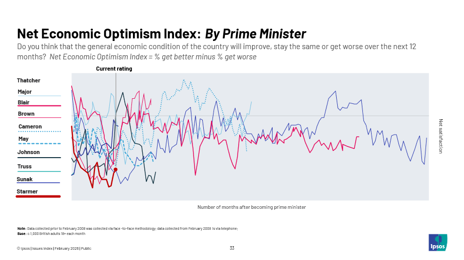 The level of net economic optimism this month (nineteen months into Keir Starmer’s premiership) remains the lowest record for a new Prime Minister at this stage, similar to that of Margaret Thatcher in October 1979 (-52).