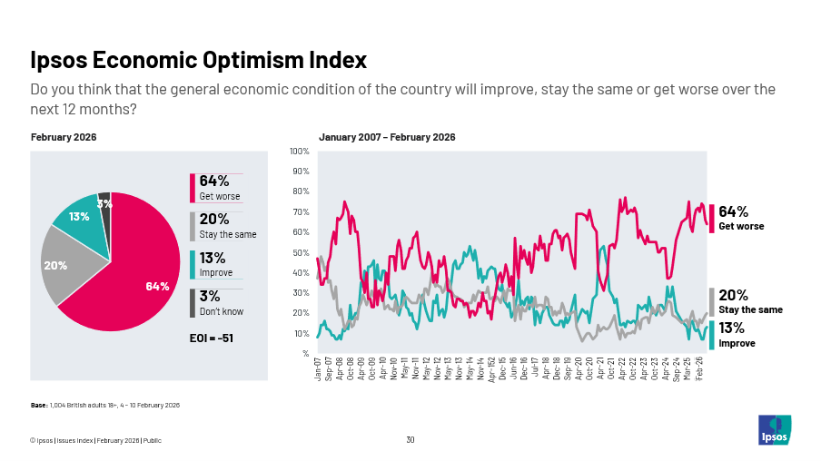 The February results show 13% think the economy will improve and 64% get worse, giving a net Ipsos Economic Optimism Index figure of -51. This is a small improvement since January (when it was -54), itself an improvement from the December 2025 index score of -66.