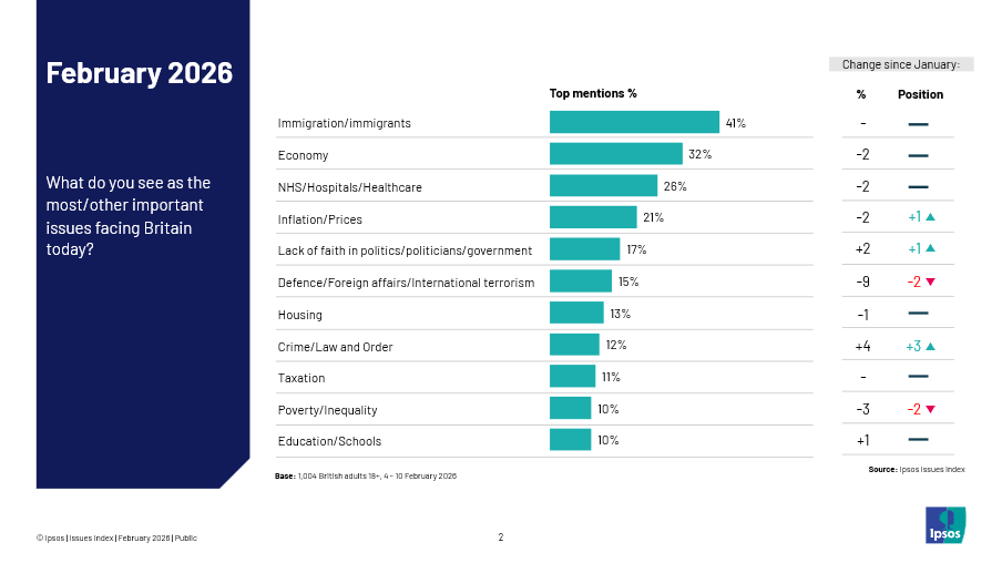 The February 2026 Ipsos Issues Index reveals that immigration continued to be seen as the biggest issue facing the country that month. Forty-one per cent of the public saw it as a concern, unchanged since January. The economy and NHS remained the second- and third-biggest issues, mentioned by 32% and 26% respectively. Inflation (21%) and lack of faith in politicians and politics (17%) round out the public’s top five biggest issues.