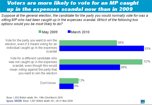 Over half of the public now say that they would vote for the party they want to win the election, even if it meant voting for an individual caught up in the expenses scandal.