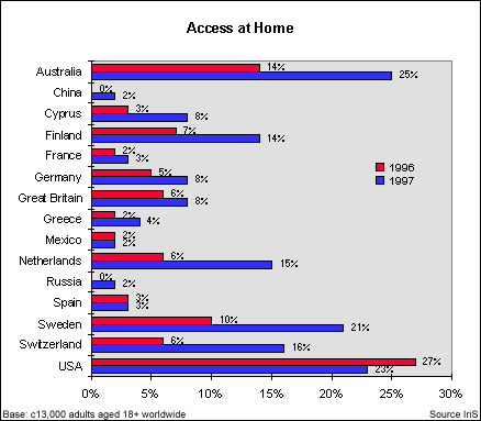 The IriS Internet Usage Survey has been tracking worldwide internet awareness and usage since 1996. The current survey is based on over 13,000 interviews conducted in 15 countries in early 1998 (Australia, China, Cyprus, Finland, France, Germany, Great Britain, Greece, Mexico, Netherlands, Russia, Spain, Sweden, Switzerland and the United States). The IriS (International Research Institutes) network, represented by MORI in Great Britain, is an association of 30 independent research companies in North and South America, Europe, Australia, and Asia.