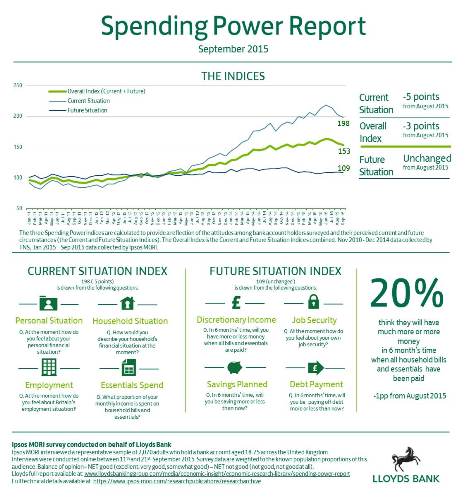 The Lloyds Spending Power Report monitors sentiment towards spending, borrowing and saving amongst UK bank account holders aged 18 – 75. The survey is run by Ipsos on behalf of Lloyds Bank.