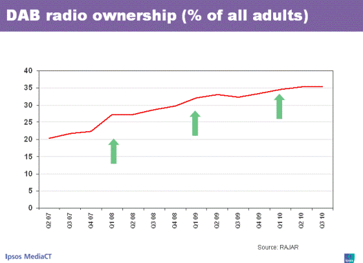 Trend analysis of RAJAR data shows that the percentage of adults owning DAB radios often records a step-change uplift in Q1 each year, following what is known as the `Christmas effect'. Whether these gifts were received with smiles and gratitude or a thinly concealed look of disdain remains unrecorded in the research. That said, the trend appears to have slowed down in 2010 with a much less marked post-Christmas uplift.