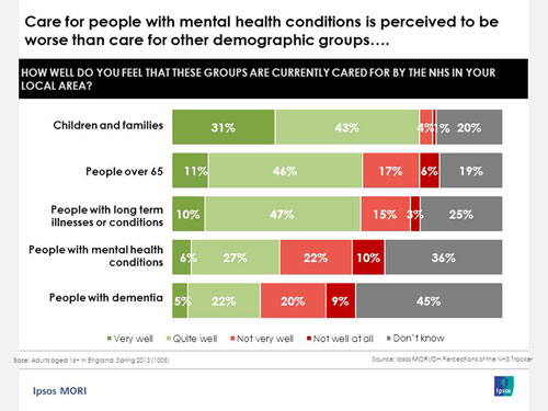 Indeed, our public perceptions research for the Department of Health, conducted in 2013, indicated that, among the general public, care for people with mental health conditions or dementia was perceived to be worse than the care received by other key patient groups – only 33% felt that people with mental health conditions were well cared for, compared to 74% saying this for children and families and 57% for people over 65. And they were pessimistic about the future; only 20% thought the care provided for people with mental health conditions would get better over the next few years.