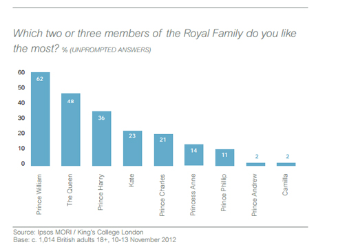 But it is Prince William, rather than the Queen or Prince Charles, who is most popular Royal of all. When people were asked to name the two or three members of the Royal Family they liked the most, he came top of the list, picked by 62%, ahead of the Queen (48%), Prince Harry (36%) and the Duchess of Cambridge (23%). Moreover, the younger Royals are even more popular with the younger generations than with the public as a whole. Given that one of the few apparent signs of weakness in the public standing of the Monarchy is that support is a little lower among the young, this is clearly a good sign. William, Kate and Harry are, presumably, going to be with us a long time and, if their popularity with Britons of their own age can help further to buttress support for the institution, the public’s newly burgeoning confidence in the Monarchy’s future may well prove justified.