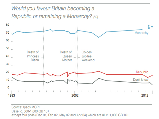 The Monarchy has as strong a place in the affections of the British public, as it has for two decades. All of our polls during the year asking people whether they favoured retaining the Monarchy or would prefer a republic found support for the Monarchy between 77% and 80%, higher than the previous record of 75% in our long series of polls stretching back to 1993. Moreover, with the last of these three polls having been conducted in November, there is no sign that support has begun to slip back as the euphoria of the Jubilee and the Olympics becomes a memory.