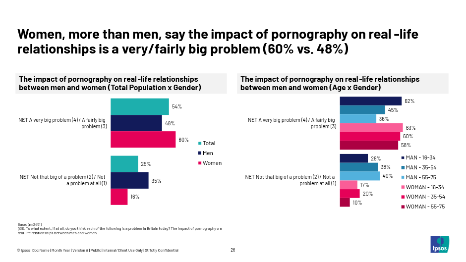 - The impact of porn on real-life relationships between men and women: 54% of the public think that the impact of porn on real-life relationships between men and women is a problem. Women (60%) are more likely to consider this a problem relative to men (48%). There is little differentiation amongst women of different ages; however, men aged 18-34 are significantly more likely to consider this a problem (62%) compared to men in older age groups (45% among men aged 35-54; 36% among men aged 55-75).