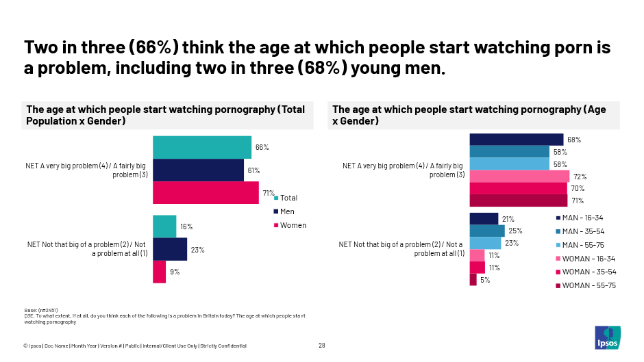 - How easy it is to access porn: More than half (57%) of Britons think the ease of accessing porn is a problem, rising to 2 in 3 (65%) women and falling to half (50%) of men. While older women (55-75, 69%) are more concerned than younger women (18-34, 60%), concern is higher amongst younger men (54%) than older men (c48%).