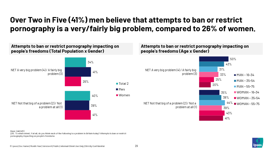 - Attempts to ban or restrict porn impacting on people’s freedoms: 1 in 3 (34%) Britons think attempts to ban or restrict porn impacting on people’s freedoms is a problem, rising to 2 in 5 (41%) men and falling to 1 in 4 (36%) women. Men aged 18-34 are most likely to hold this opinion (50%), with young women significantly more likely to feel this way relative to older age groups (33%).