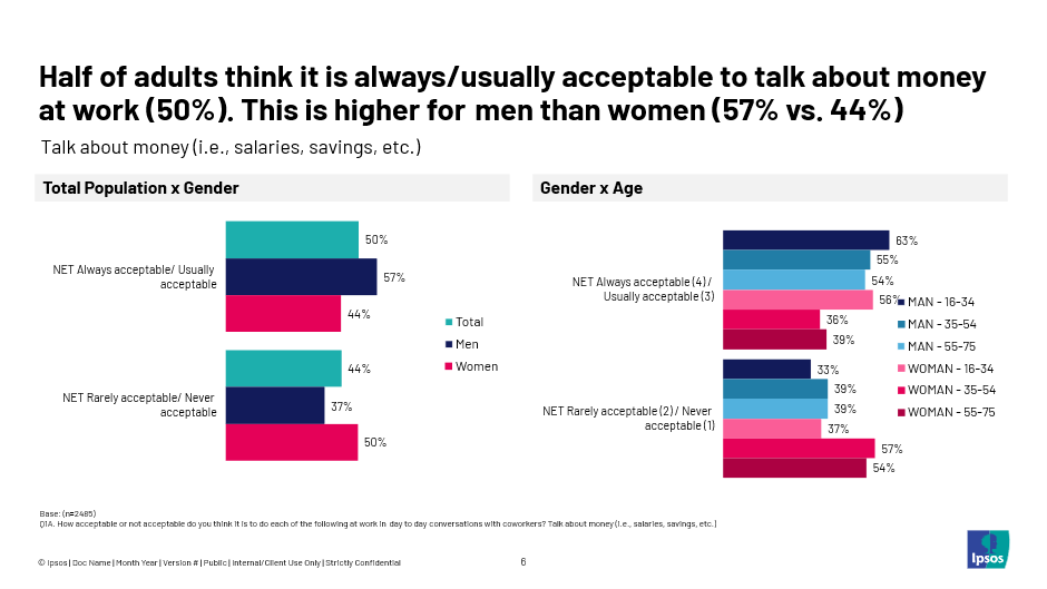 - Money: Nearly 3 in 5 (57%) men think it’s acceptable to talk about money (i.e., salaries, savings, etc.) at work, falling to 44% amongst women. Those aged 16-34 of both genders are the most likely to find this acceptable, with women aged 16-34 significantly more likely to say so (56%) as compared to women aged 35-54 (36%) and 55-75 (39%).
