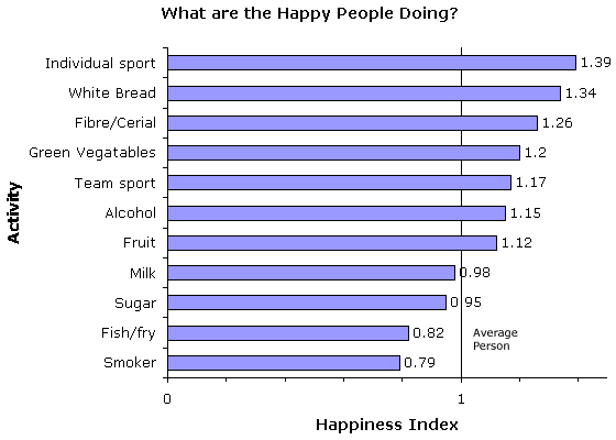 In the survey for our book, Typically British, published in 1991, Eric Jacobs and I hoped to identify the secret to happiness. We compared the percentages of the adult population in Britain who said they were 'very happy' to those who said they were 'unhappy'to obtain a 'Happiness Index', and found that people who take part regularly in individual sports, or exercise, 22% of the population, were more than a third (+39%) more likely to be happy than the average. Those six in ten who had eaten wholemeal bread were a third (34%) more likely to be happy, and people who'd eaten high fibre or wholemeal cereal were a quarter (26%) more likely to be happy.