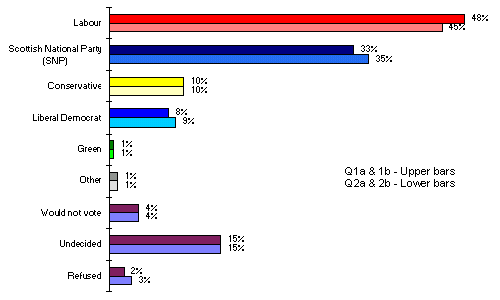Q1a Thinking about the first vote, which party's candidate would you vote for, if the election for the Scottish Parliament were tomorrow?If undecided or refused