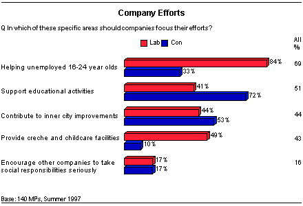 Unemployed 16-24 year olds should be the main focus of companies' community efforts, say nearly 70% of MPs. Priorities differ widely though depending on political allegiance. For 84% of Labour MPs, youth unemployment is the priority issue. Support for educational activities and help with inner city improvements are deemed more important areas for company support by Conservative MPs. Labour and Conservative MPs also had different views about the importance of company support in providing cr?ches and childcare facilities. Nearly half of Labour MPs thought companies should focus their efforts on childcare compared to only 10% of Tory MPs. One in six MPs believes companies should focus their efforts on encouraging other companies to take social responsibilities seriously. However, opinions vary significantly by region: a third of Welsh MPs but no Scottish MPs would like companies to be more active on this issue.