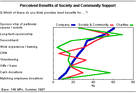 Companies which engage in long-term sponsorship are perceived by MPs to provide benefits to the community and charities as well as the company itself. In contrast companies which sponsor particular causes are seen by MPs to be the main beneficiary of their activities. When companies make cash donations however, MPs believe it's the charity that gains most.
