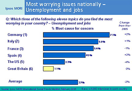 The British do recognize their relative economic success. For example, just 11% of people in Britain see unemployment as the most important issue facing the country, which is by far the lowest level across the countries surveyed, and compares with 71% in Germany, 59% in Italy and 54% in France. Even the US is more focused on jobs, with 23% saying unemployment is the most important national issue. This suggests that people have a great deal of sensitivity to unemployment as an issue, as differences in actual rates are not nearly as large as differences in levels of concern imply, varying from around 5% in the UK and US, 7.5% in Italy, 8.4% in Spain and up to around 9% in France and Germany.