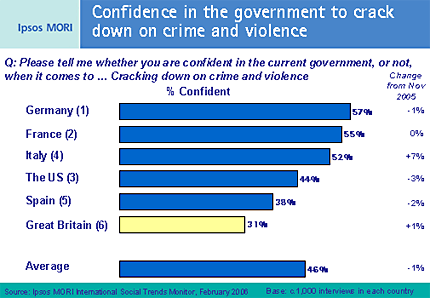 And the really bad news for the British government is that, in the same way they get credit for the economy, they get the blame for perceived failures in health care and crime. So, for example, just 31% are confident in the government to crack down on crime and violence in Britain, compared with almost double that in Germany.