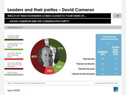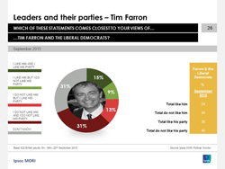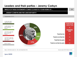 Ipsos interviewed a representative sample of 1,255 adults aged 18+ across Great Britain. Interviews were conducted by telephone 19-23 September 2015. Data are weighted to match the profile of the population. As an interim measure, and to preserve our long-term trends on voting intentions, our headline indicator is now changed to take into account past voting behaviour (do people always or usually vote in general elections, or say it depends) as well as stated likelihood to vote in an upcoming election (those who say they are at least 9 out of 10 certain to vote). As part of our post-election methodological review, we have introduced a new weighting by newspaper readership to improve the representativeness of our sample, using targets derived from the National Readership Survey. As our internal review continues, however, and as we look to learn from the British Polling Council’s own inquiry, we anticipate we will make further refinements to our methodology in the future.