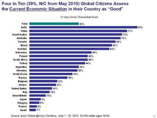 The Indians (85 percent) and Chinese (77 percent) are the most positive about their economies, while Britain is ahead of only Japan (9 percent), Hungary (8 percent), France (6 percent) and Spain (5 percent).