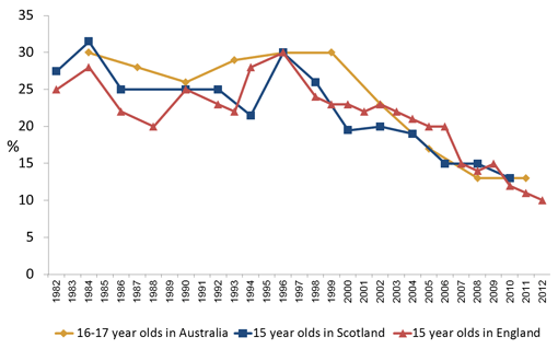 Sources: Australian Secondary Students’ Alcohol and Drug Survey (White V, Bariola E. Australian secondary school students’ use of tobacco, alcohol, and over-the-counter and illicit substances in 2011. Melbourne: Centre for Behavioural Research in Cancer, Cancer Council Victoria; 2012 Dec.); Smoking, Drinking and Drug Use Among Young People in England (http://www.hscic.gov.uk/catalogue/PUB11334 Chapter 2 part A, Table 2.3); Scottish Schools Adolescent Lifestyle and Substance Use Survey (SALSUS) (Black C, Eunson J, Sewel K and Murray L. Smoking, Drinking and Drug Use Among 13 and 15 Year Olds in Scotland in 2010. ISD Scotland: 2011). Note: Australian data based on those who have smoked in past 7 days; English and Scottish data based on those who usually smoke at least one cigarette a week