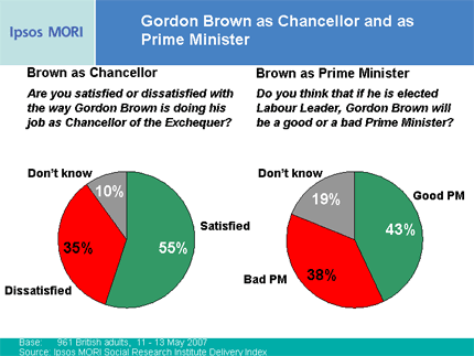 More than two in five Britons now believe that Gordon Brown will be a good Prime Minister (43%), slightly more than the proportion who believe that he will be a bad Prime Minister (38%). These again are much improved ratings for Brown in comparison with those found after his Budget earlier in the year, when only one in four believed that he would make a good Prime Minister (25%), and more than two in five that he would not (42%). It appears to be the case that since the Budget, many people who then did not give an opinion either way on Brown are now feeling optimistic about his Premiership. Whether this group will stay positive in the longer term is one of the key challenges facing the prospective Prime Minister.