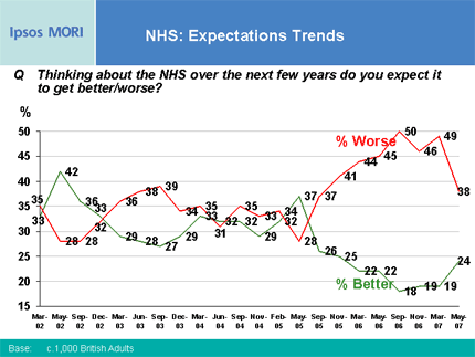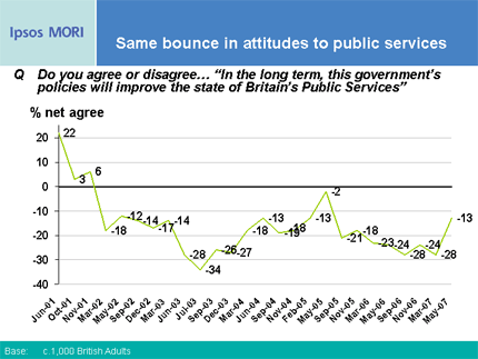 There has been a similar increase in the number of optimists on the Government's ability to improve public services, with net optimism here having improved from -28 in March to -13 now (although as the net score indicates, optimists are still outnumbered by pessimists by 38% to 51%).