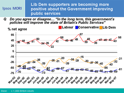 A further noticeable trend in recent Delivery Index waves is that supporters of the Liberal Democrats have gradually become more optimistic about the Government in recent month -- such as on their ability to improve public services and the NHS. Might this increasing popularity of the Government among Liberal Democrats indicate that their 'left-leaning' supporters are preparing to return to support the Labour Party perhaps to fend off the challenge of David Cameron's Conservatives or as blame for Labour about the Iraq War declines with a change of leader?
