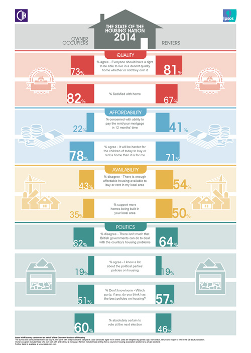 Technical information Ipsos conducted a survey for the Chartered Institute of Housing involving 2,000 GB adults aged 16-75 online. The survey was conducted between 30 May-4 June 2014. Data are weighted by gender, age, work status, tenure and region to reflect the GB adult population.