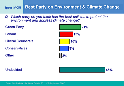 However, the backing has yet to translate into political advantage, even if the subject still remains there for the taking. When asked who they feel has the best policies to protect the environment and address climate change, 45% say they have yet to make up their minds. Among the three main political parties the situation is finely balanced -- 13% identify Labour, 10% the Liberal Democrats and 9% the Conservatives. The Green Party comes top with 21%.