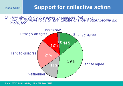 The call for a collective response lies in the public's demand for assurances that their individual actions will be matched by others: over half (54%), fearful of making personal sacrifices that would quickly be negated by 'free riders', say they would take more steps on climate change if others did too. Fairness and equity are clearly key.