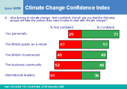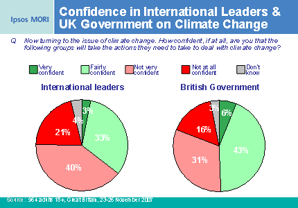 Phil Downing, Head of Environmental Research at Ipsos, says "Public confidence in the Government's ability to take the actions required to address climate change has increased of late, in response to policy landmarks such as the Stern Review, the Climate Change Bill and the recent attention given to the environmental agenda by the three main parties. However, this is not true of confidence in the ability of international leaders to come together and agree an effective climate change deal to succeed the Kyoto Protocol".