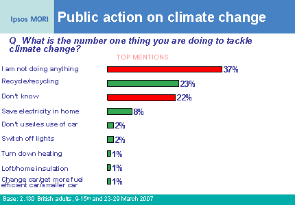 What this means remains unclear: a public increasingly knowledgeable and equipped to act? Or an underestimation among people of the scale of change required? A study conducted by Ipsos on behalf of the Environment Agency earlier this year on the kinds of actions people are already taking hints at the latter. This showed that 59% are not doing anything or don't know what they're doing to tackle climate change. Indeed, the fact that public actions in 2007 remain, for the most part, limited to recycling and home energy efficiency suggests that there may be a disconnect between what the public consider as "doing their bit" and the aspirations of Government for individual and societal behaviour change, most notably around transport and travel.