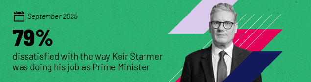 Only 13% were satisfied with the way Starmer was doing his job as PM, with 79% dissatisfed, giving him a net rating of -66. This is the lowest satisfaction rating recoded by Ipsos for any PM going back to 1977, making him the most unpopular PM on record in 45 years. Previous record holders include Rishi Sunak (-59, April 2024) and John Major (-59, August 1994).