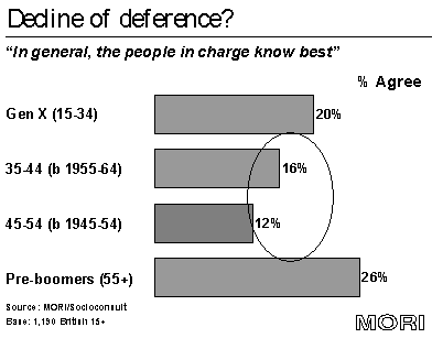 What ever the reason, compared to both younger and older people this age group are the least deferent in society -- least likely to agree that the "people in charge know best":
