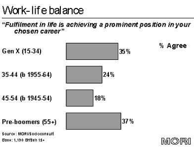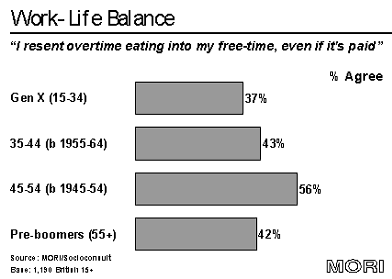 Other manifestations of their difference from older and younger people are their rejection of material success and brands -- not only are they least interested in brands of all age groups -- more so than the older "grey panthers", but they are most fed up with the rat race. Of all age groups they have the deepest concern about the work-life balance, with the majority resenting overtime -- even if they get paid for it.