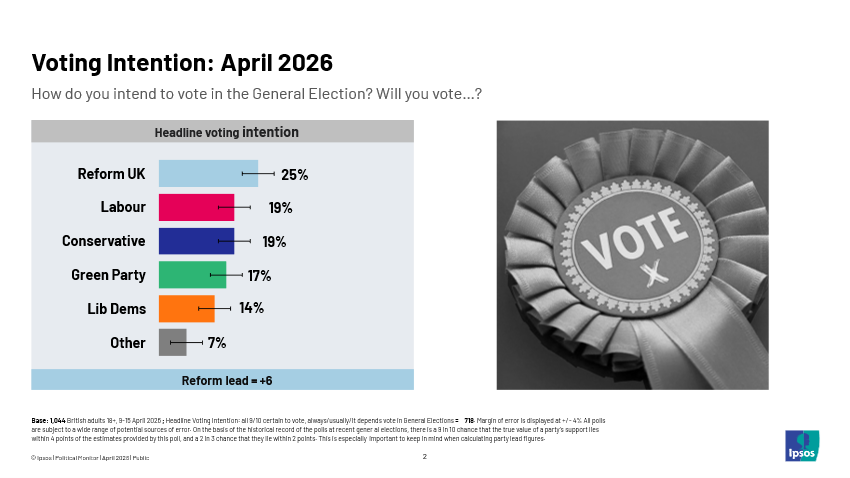 - Reform UK still hold a clear lead on 25%, but this lead is six points - one point down from March. This continues a steady decline in Reform’s vote share from a high of 34% in September 2025